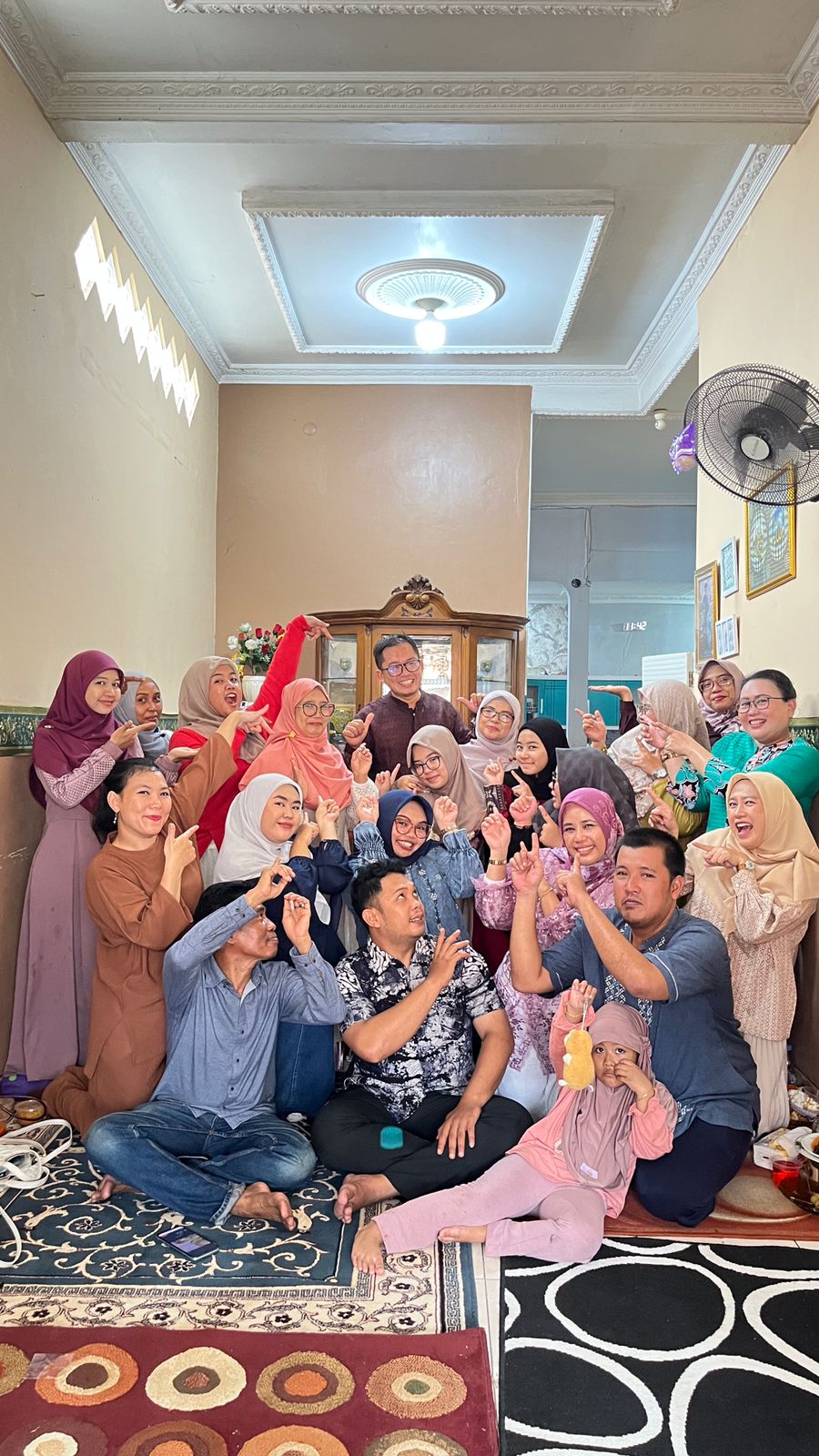 Ketika sesi foto bersama dimulai, keceriaan semakin terasa. Ada yang tersenyum rapi, ada pula yang bergaya spontan penuh canda. Jari-jari saling menunjuk, tawa pecah tanpa henti, bahkan anak kecil yang ikut hadir pun menambah warna kebahagiaan di tengah mereka. Momen itu seolah membekukan waktu—mengabadikan kebersamaan yang tulus dan tak tergantikan.