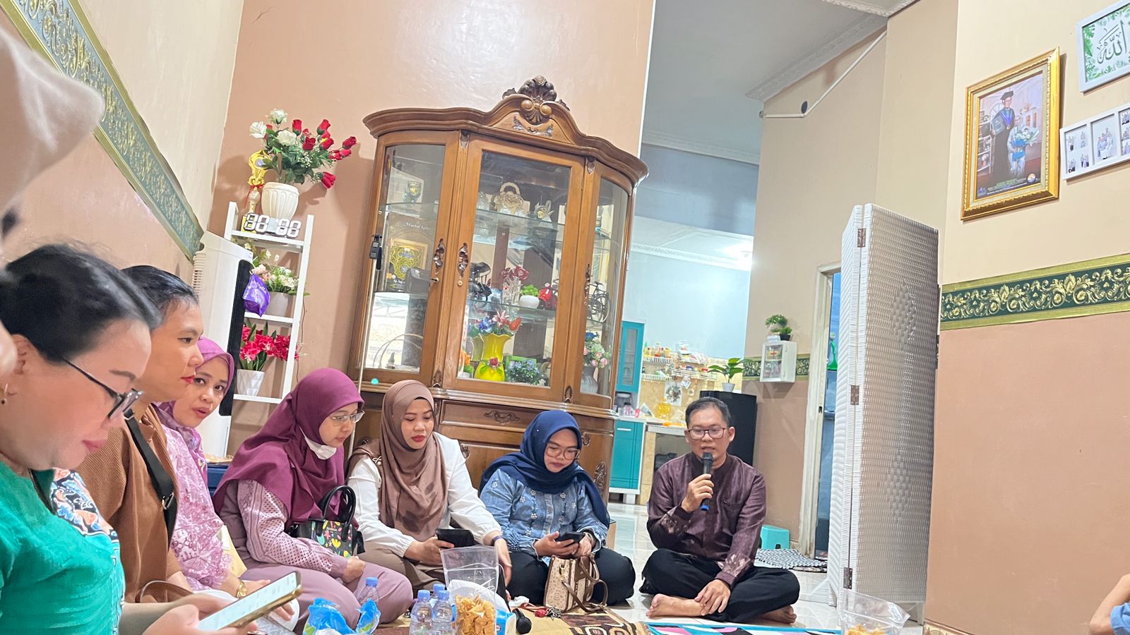 Acara berlanjut dengan duduk santai di lantai, menikmati hidangan sederhana yang tersaji. Di sudut ruangan, seorang ibu guru berbagi cerita dengan mikrofon di tangan, disambut tawa hangat dari rekan-rekannya. Tak ada sekat jabatan, semua larut dalam suasana akrab, seolah menjadi satu keluarga besar yang saling menguatkan.