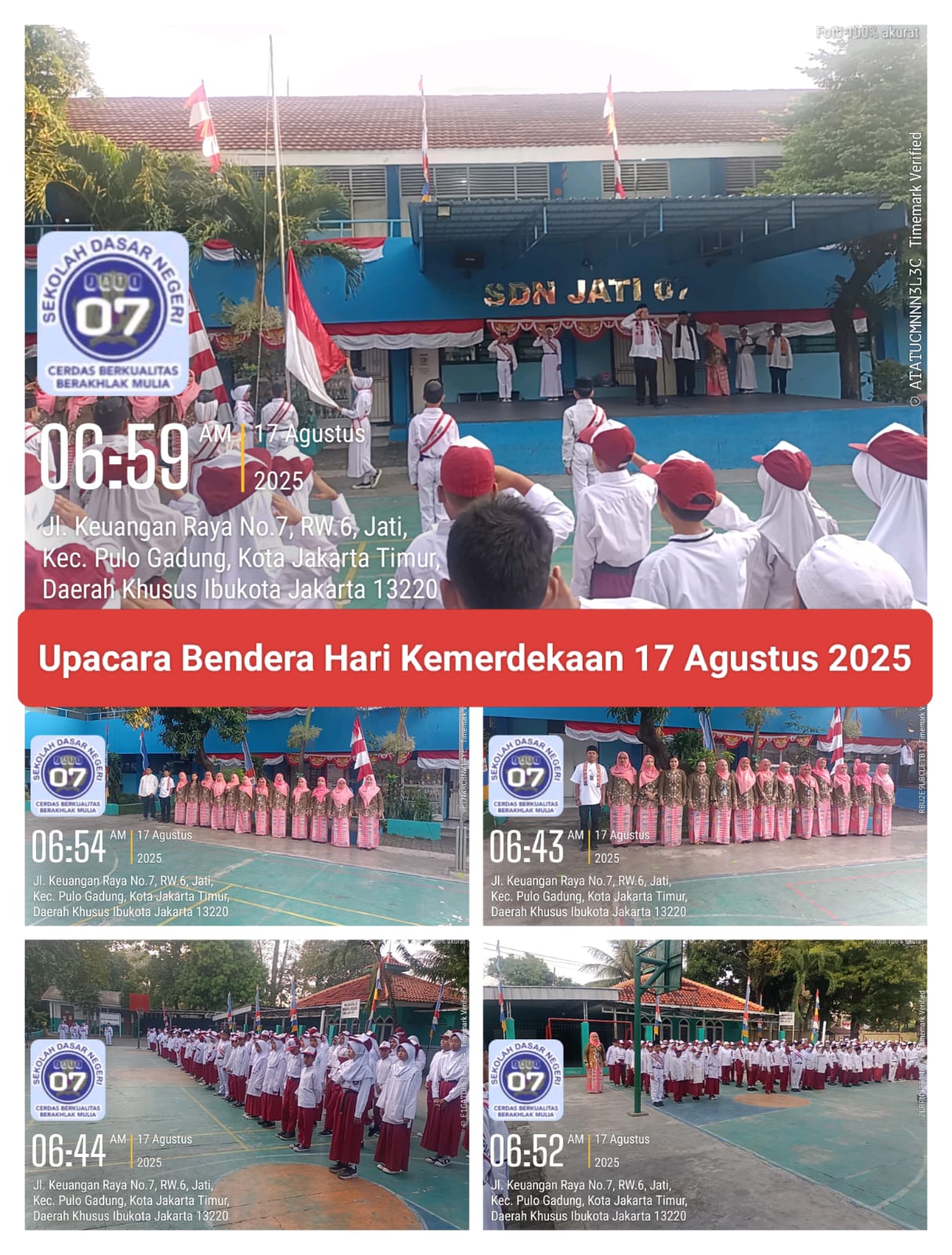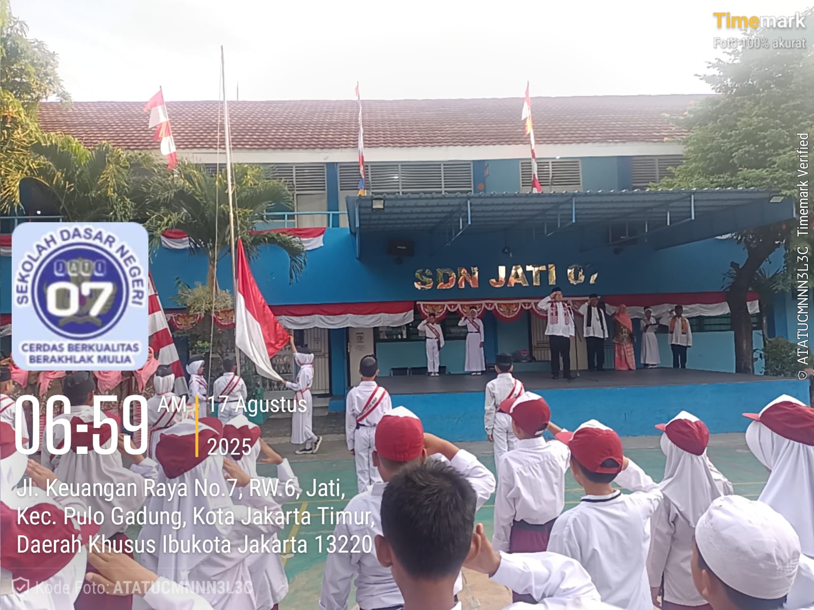 Dalam rangka memperingati Hari Lahir Pancasila, SDN Jati 07 melaksanakan upacara bendera pada hari Senin, 2 Juni 2025 di halaman sekolah. Upacara berlangsung dengan khidmat dan tertib, serta diikuti oleh seluruh warga sekolah yang terdiri dari peserta didik kelas 1 hingga kelas 6, dewan guru, tenaga kependidikan, dan staf sekolah.