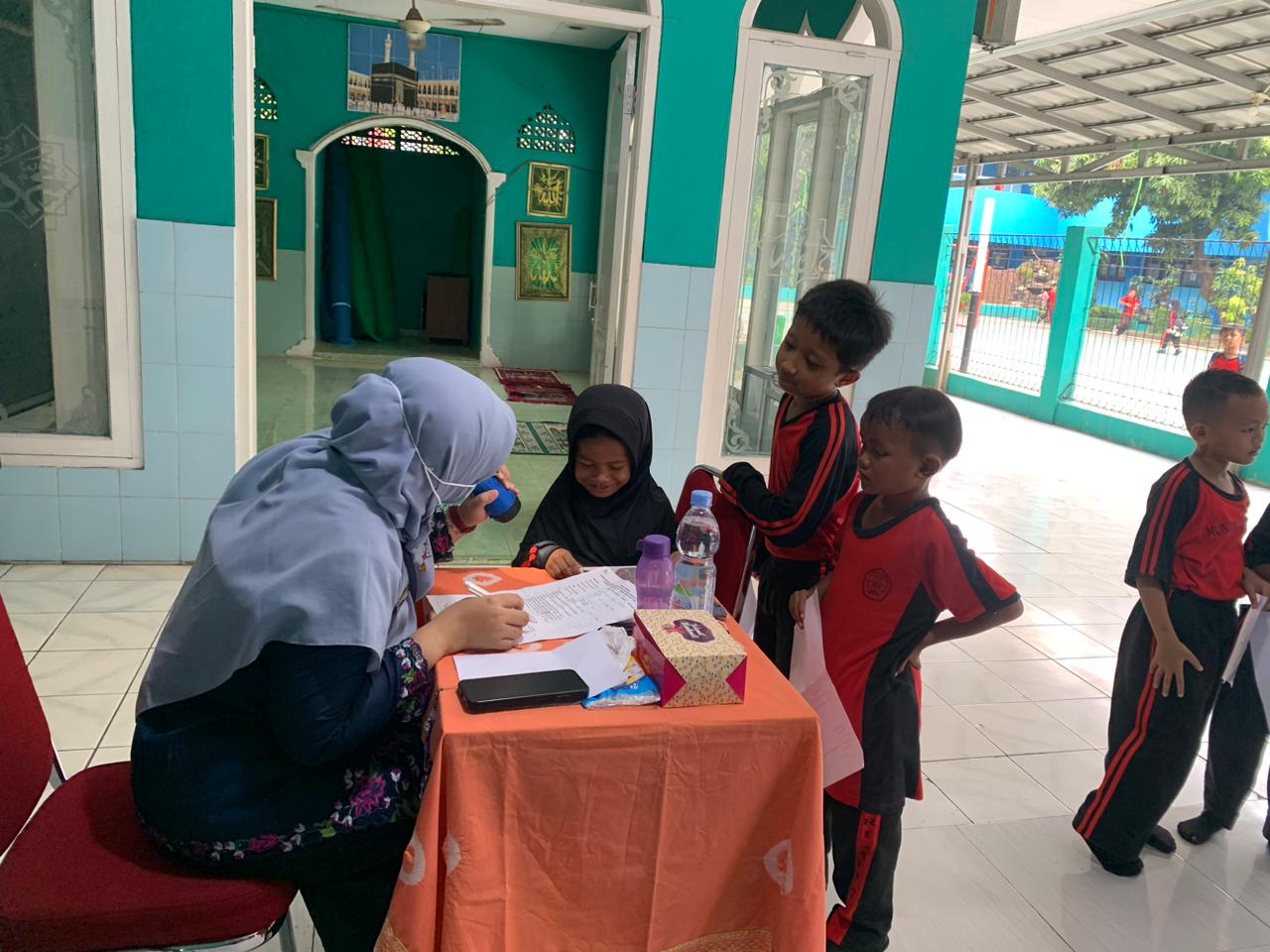 Imunisasi dilakukan di area dalam mushola sekolah yang telah ditata rapi menjadi ruang layanan kesehatan sementara. Para tenaga kesehatan hadir lengkap dengan perlengkapan medis, meja registrasi, serta area observasi untuk memastikan seluruh tahapan imunisasi berjalan aman dan nyaman.