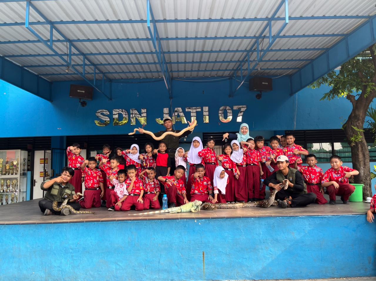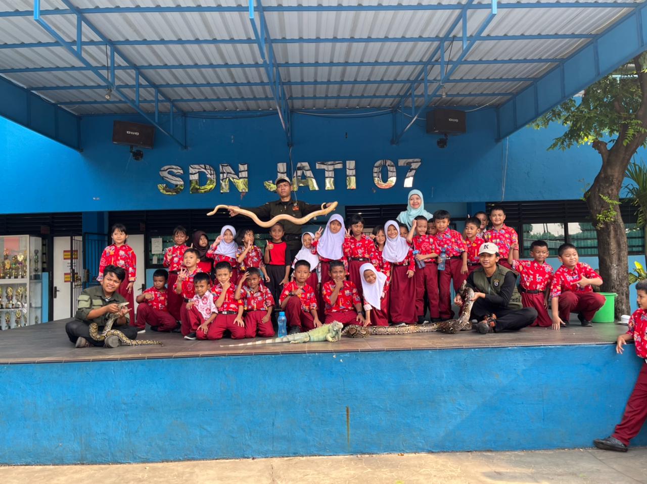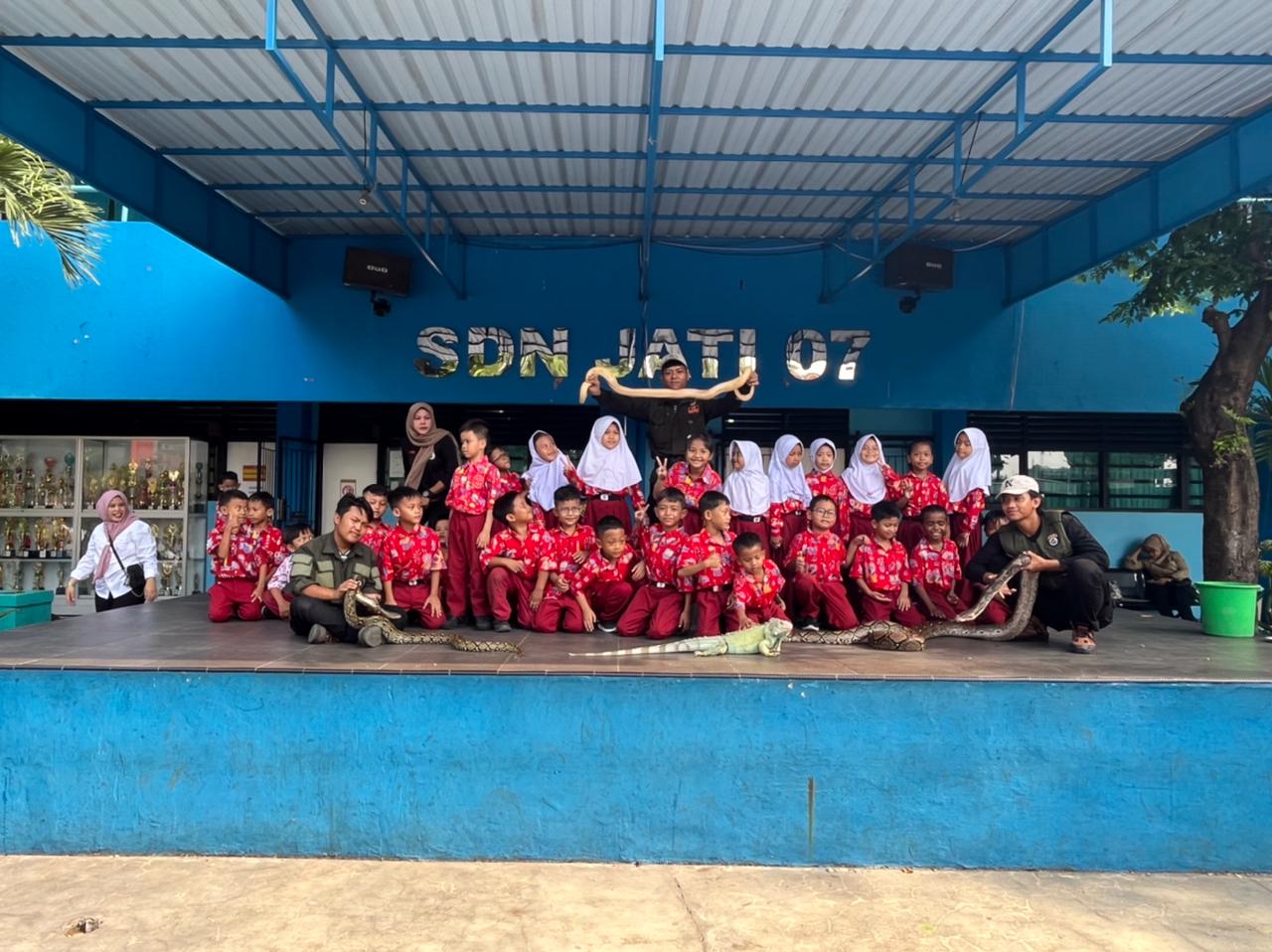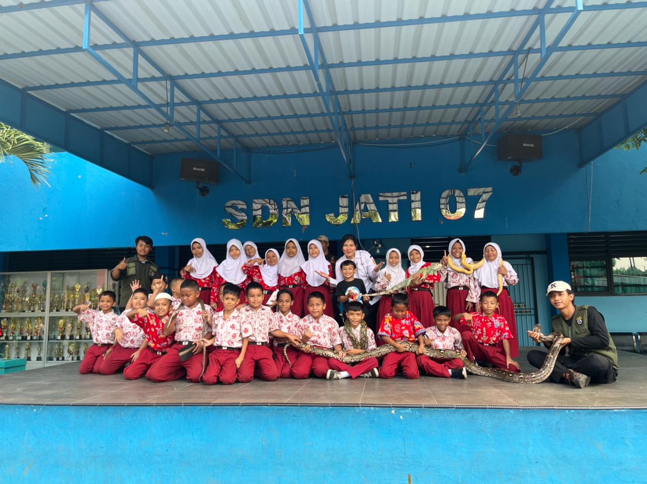 Para siswa tampak sangat antusias dan penasaran, terutama saat petugas menunjukkan secara langsung beberapa hewan yang dibawa. Mereka dengan seksama mendengarkan penjelasan, bahkan berani mendekat untuk melihat dan menyentuh satwa dengan didampingi petugas. Suasana lapangan sekolah pun terasa hidup, penuh dengan rasa ingin tahu dan keberanian dari para peserta didik. Tak hanya siswa, para guru dan tenaga kependidikan SDN Jati 07 juga turut aktif mengikuti kegiatan ini. Mereka memberikan dukungan dan bimbingan agar anak-anak dapat belajar dengan aman serta memahami pentingnya menjaga keseimbangan antara manusia dan satwa liar.