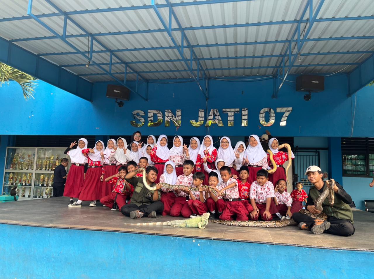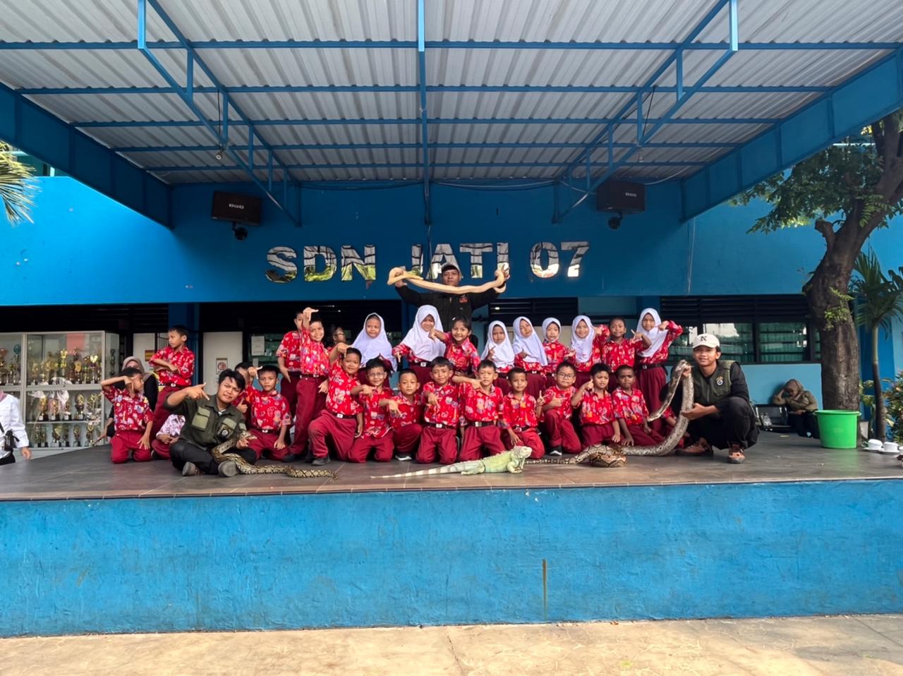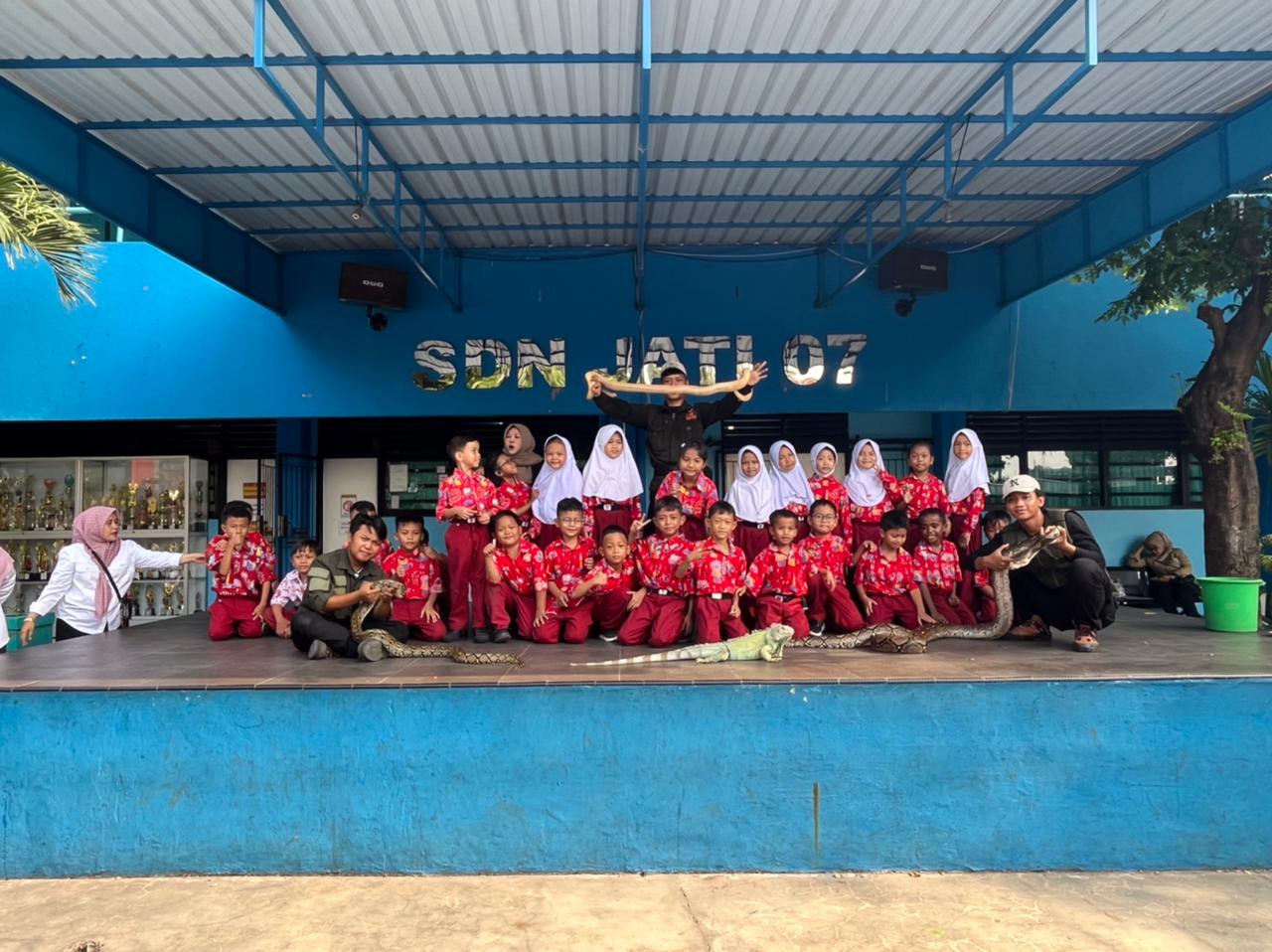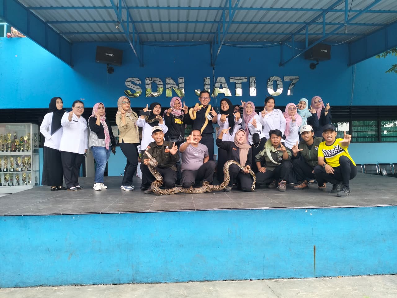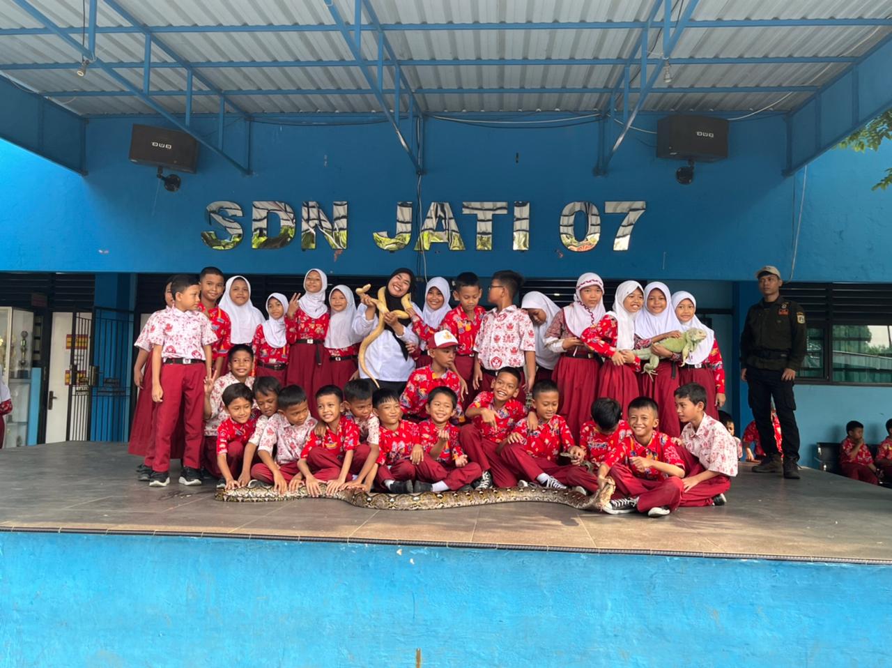Para siswa tampak sangat antusias dan penasaran, terutama saat petugas menunjukkan secara langsung beberapa hewan yang dibawa. Mereka dengan seksama mendengarkan penjelasan, bahkan berani mendekat untuk melihat dan menyentuh satwa dengan didampingi petugas. Suasana lapangan sekolah pun terasa hidup, penuh dengan rasa ingin tahu dan keberanian dari para peserta didik. Tak hanya siswa, para guru dan tenaga kependidikan SDN Jati 07 juga turut aktif mengikuti kegiatan ini. Mereka memberikan dukungan dan bimbingan agar anak-anak dapat belajar dengan aman serta memahami pentingnya menjaga keseimbangan antara manusia dan satwa liar.