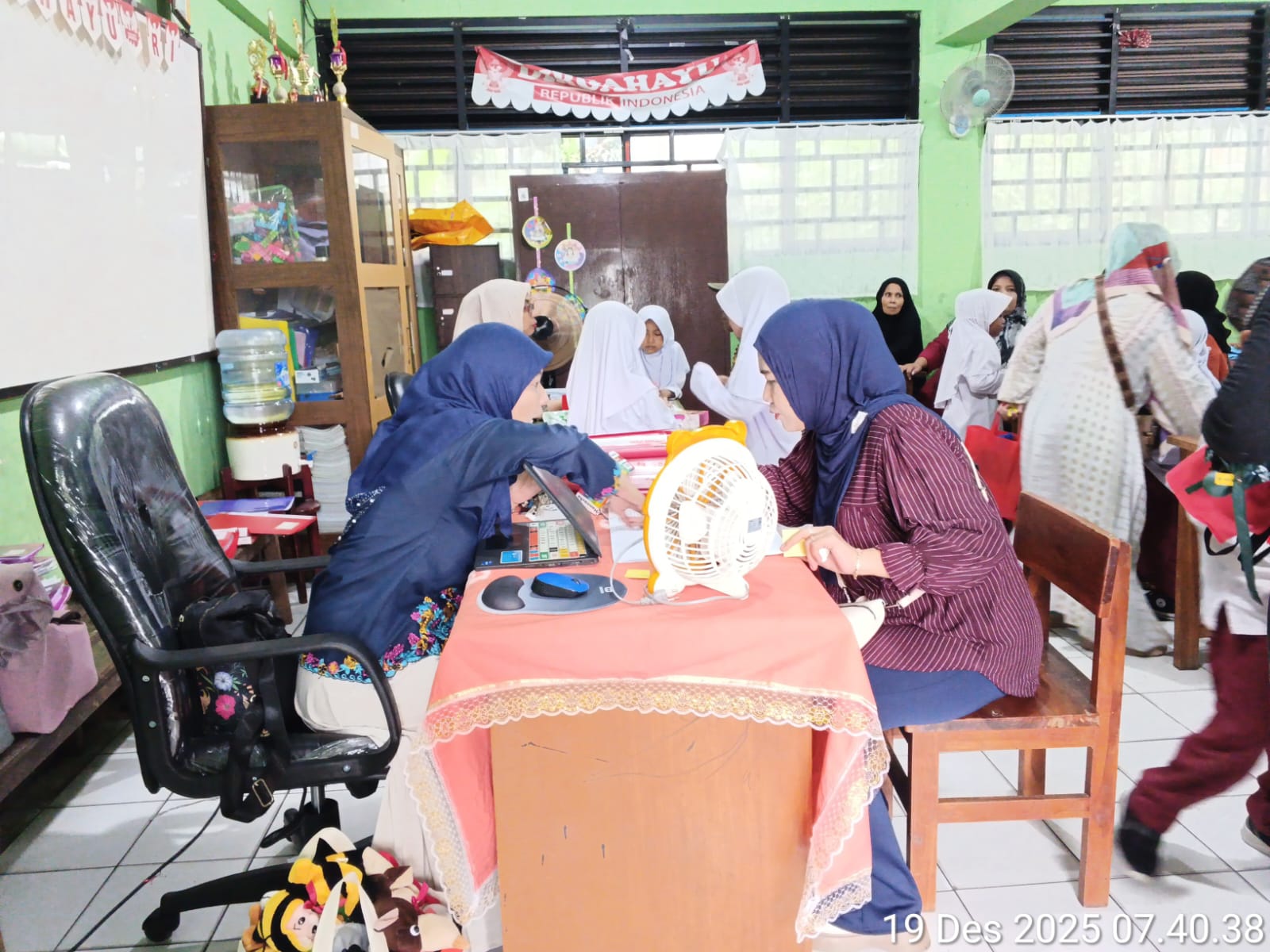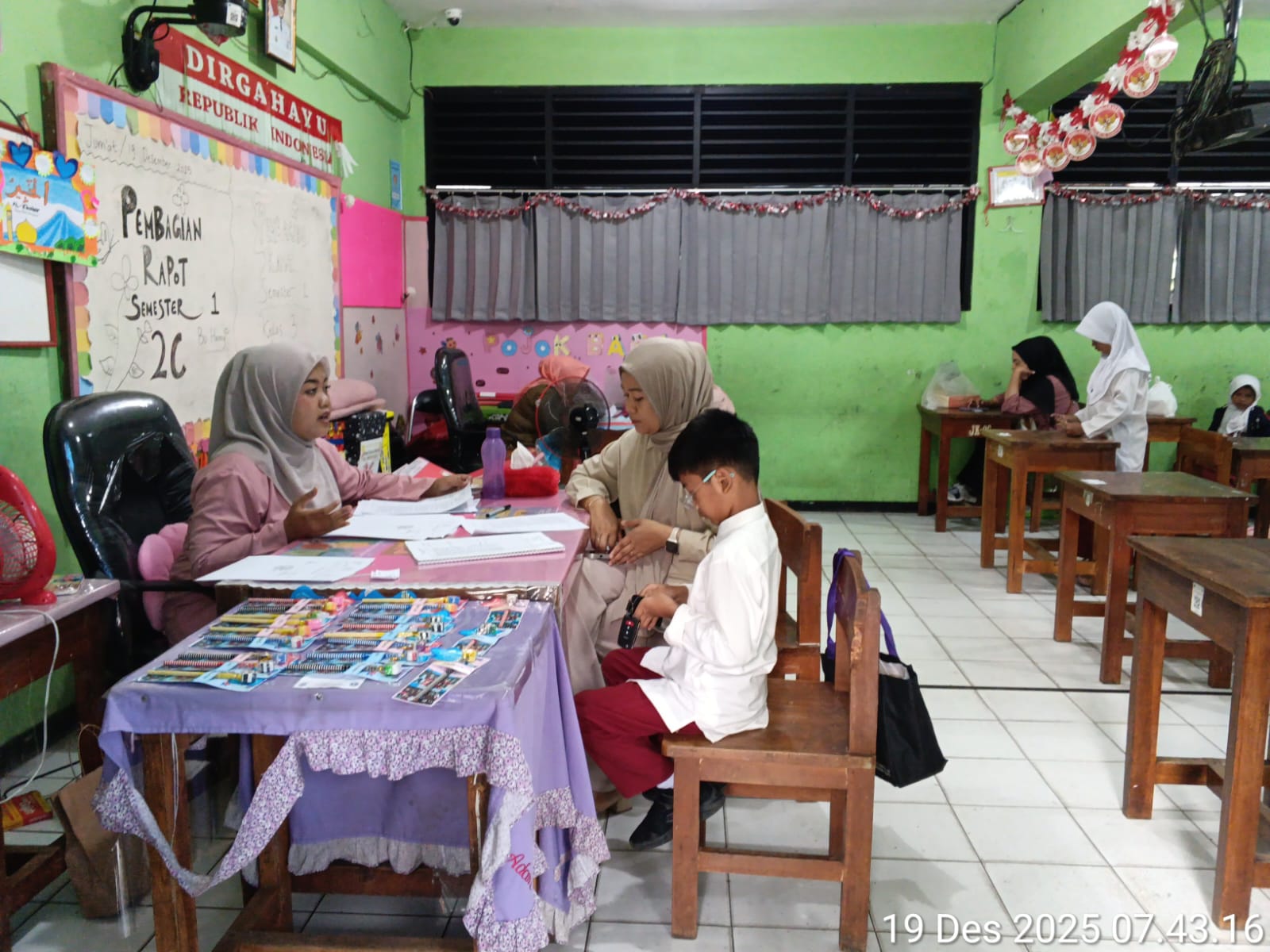 Dalam proses pembagian rapor, guru menyampaikan hasil belajar peserta didik secara langsung dan rinci. Rapor disertai penjelasan mengenai capaian akademik maupun nonakademik, termasuk perkembangan sikap, kedisiplinan, dan keterampilan siswa selama satu semester. Orang tua tampak antusias menyimak setiap penjelasan, mengajukan pertanyaan, serta memberikan respons positif terhadap informasi yang disampaikan.