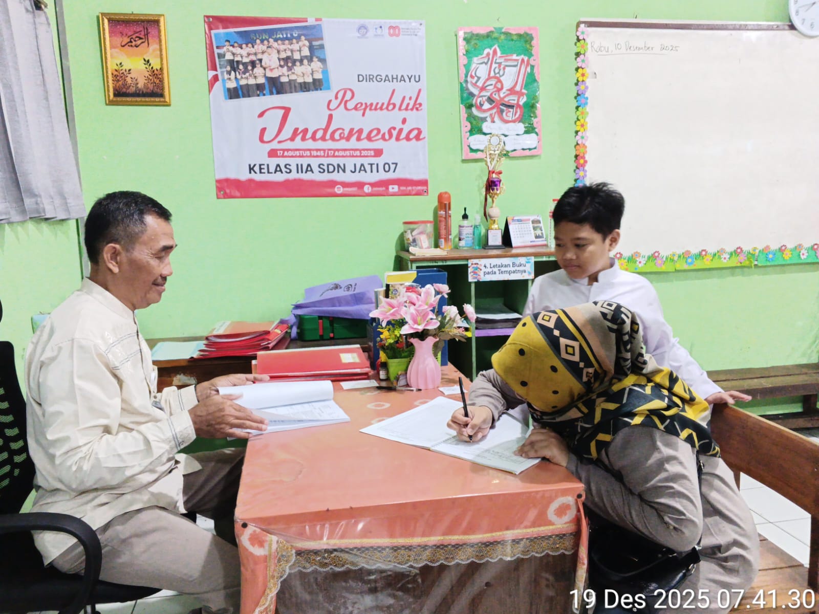 SDN Jati 07 melaksanakan kegiatan Pembagian Rapor Semester Ganjil Tahun Ajaran 2025/2026 pada Jumat, 19 Desember 2025. Kegiatan ini berlangsung dengan tertib, hangat, dan penuh makna sebagai momentum penting untuk menyampaikan capaian hasil belajar peserta didik sekaligus memperkuat sinergi antara sekolah dan orang tua/wali.