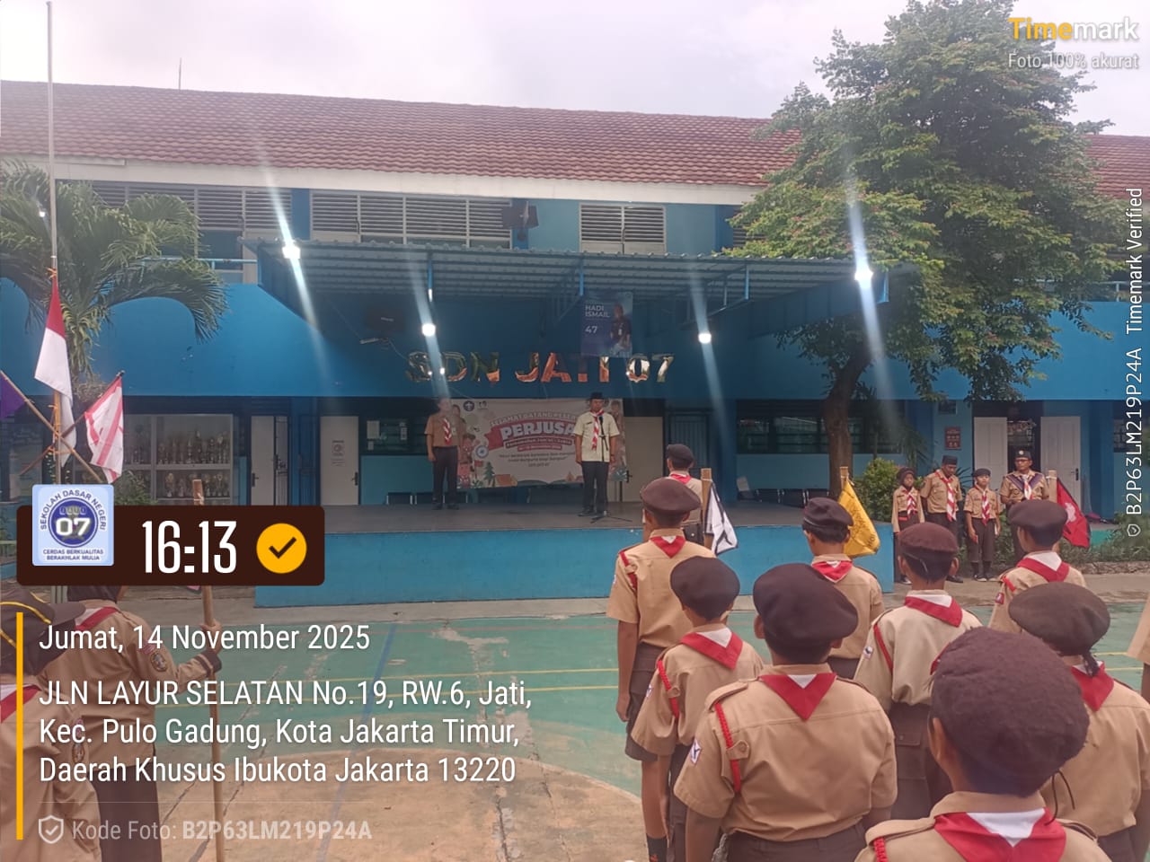Kegiatan Perkemahan Jumat–Sabtu (Perjusa) Gugus Depan SDN Jati 07 resmi dibuka pada Jumat, 14 November 2025, bertempat di lapangan sekolah yang berlokasi di Jln. Layur Selatan No. 19, Jati, Pulo Gadung, Jakarta Timur. Seluruh peserta didik—baik putra maupun putri—mengikuti kegiatan pembukaan dengan penuh semangat dan tertib.