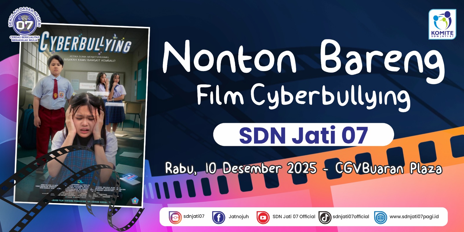 Rabu, 10 Desember 2025, halaman SDN Jati 07 dipenuhi suasana antusias. Sejak pukul 07.30, para guru pendamping bersama 135 murid sudah berkumpul rapi sambil membawa banner kegiatan Nonton Bareng Film Cyberbullying. Senyum, tawa kecil, dan rasa ingin tahu dari para siswa terlihat jelas saat mereka bersiap menuju CGV Buaran Plaza.